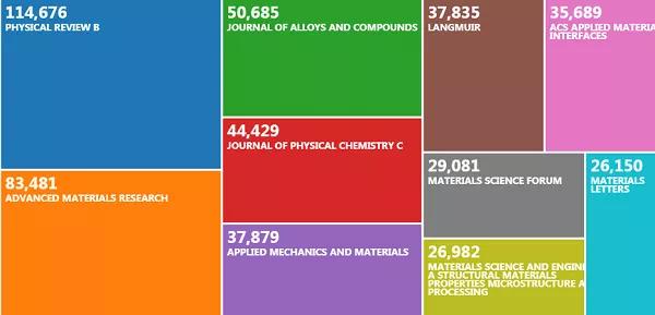 來(lái)源出版物方面,21世紀(jì)材料發(fā)文量排名前三的期刊是Physical Review B、Advanced Materials Research和Journal of Alloys and Compounds,其中Physical Review B發(fā)文量更是超過(guò)了10萬(wàn)篇,其他我們耳熟能詳?shù)钠诳€包括ACS Applied Materials and Interfaces和Langmuir等。