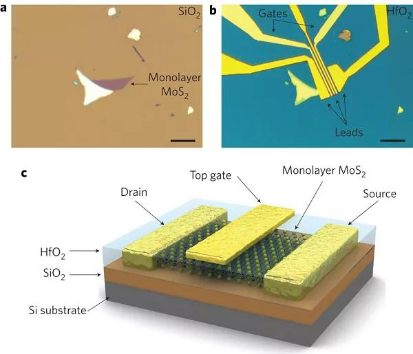 二維材料在下一代納米電子器件中的應(yīng)用很有吸引力,因?yàn)榕c一維材料相比,用它來(lái)制造復(fù)雜的結(jié)構(gòu)相對(duì)容易。研究最廣泛的二維材料是石墨烯,這是由于其具有豐富的物理性質(zhì)和高電子遷移率。但是,原始石墨烯不具有帶隙,而帶隙這一性質(zhì)對(duì)于包括晶體管在內(nèi)的許多應(yīng)用都是必不可少的。設(shè)計(jì)石墨烯帶隙會(huì)增加制造復(fù)雜性,或者將遷移率降低到應(yīng)變硅膜的水平,或者需要高電壓。盡管單層MoS2具有1.8 eV的大固有帶隙,但先前報(bào)道的在0.5-3 cm2·V-1·s-1范圍內(nèi)的遷移率對(duì)于實(shí)際設(shè)備而言仍然太低。此文中,作者使用氧化鉿柵極電介質(zhì)獲得了超過(guò)200 cm2·V-1·s-1的室溫單層MoS2遷移率,接近石墨烯納米帶,并展示了電流開/關(guān)比為1×108,待機(jī)功耗極低的室溫晶體管。由于單層MoS2具有直接的帶隙,因此可用于構(gòu)造帶間隧場(chǎng)效應(yīng)晶體管,與傳統(tǒng)晶體管相比,其功耗更低。單層MoS2還可以在需要薄透明半導(dǎo)體的應(yīng)用中補(bǔ)充石墨烯,例如光電子學(xué)和能量收集領(lǐng)域。