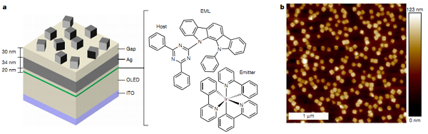 使用量子點對精確的顏色信息進(jìn)行可視化已經(jīng)探索了數(shù)十年,并且采用環(huán)保材料的商業(yè)產(chǎn)品目前可以用作背光源。然而,基于量子點的下一代電致發(fā)光顯示器需要開發(fā)有效且穩(wěn)定的無鎘的藍(lán)光發(fā)射裝置,由于藍(lán)光發(fā)射材料的光物理性能較差,這仍然是一個挑戰(zhàn)。三星先進(jìn)技術(shù)研究院介紹了ZnSe基藍(lán)色發(fā)光量子點的合成。作者發(fā)現(xiàn)氫氟酸和氯化鋅添加劑可通過消除ZnSe晶體結(jié)構(gòu)中的堆垛層錯而有效提高發(fā)光效率。另外,通過液體或固體配體交換的氯化物鈍化導(dǎo)致緩慢的輻射復(fù)合,高的熱穩(wěn)定性和有效的電荷傳輸性質(zhì)。文章在發(fā)光二極管中構(gòu)造了具有梯度氯化物含量的雙量子點發(fā)射層,以促進(jìn)空穴傳輸,并且所得器件在理論極限下顯示出效率,高亮度和長使用壽命。作者認(rèn)為高效、穩(wěn)定的藍(lán)色量子點發(fā)光器件可以促進(jìn)使用量子點的電致發(fā)光全色顯示器的開發(fā)。Efficient and stable blue quantum dot light-emitting diode.(Nature, 2020, DOI:10.1038/s41586-020-2791-x)3.UDC Nature:等離子增強(qiáng)有機(jī)發(fā)光器件的穩(wěn)定性和亮度