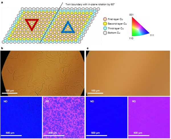 研究固體材料中電磁波和自由電子的共振相互作用的等離激元理論領(lǐng)域,由于等離激元材料中通常會發(fā)生大量損耗,因此尚未投入大規(guī)模商業(yè)應(yīng)用。由于其良好的色彩飽和度,通用的形狀因數(shù)和低功耗,有機(jī)發(fā)光器件(OLED)已被并入數(shù)十億個商業(yè)產(chǎn)品中,但在效率和穩(wěn)定性方面仍可以得到改善。盡管結(jié)合了有機(jī)熒光粉的OLED實現(xiàn)了內(nèi)部的電荷到光的統(tǒng)一轉(zhuǎn)換,但它們的折射率對比卻將設(shè)備外光子的可觀察部分降低了約25%。此外,在OLED操作期間,緩慢衰減的三重態(tài)激子和電荷的局部累積會在稱為老化的過程中逐漸降低設(shè)備的亮度,這可能會導(dǎo)致顯示屏出現(xiàn)“烙印”現(xiàn)象。同時提高設(shè)備效率和穩(wěn)定性對于OLED技術(shù)至關(guān)重要。美國UDC(Universal Display Corporation)演示了一種OLED,它利用等離子體系統(tǒng)的衰減率提高來提高設(shè)備穩(wěn)定性,同時通過結(jié)合基于納米粒子的外耦合方案從等離子體激元模式中提取能量來保持效率。使用原型磷光發(fā)射器,可以在與參考常規(guī)設(shè)備相同的亮度下將操作穩(wěn)定性提高兩倍,同時還可以從等離激元模式中提取16%的能量作為光。這個工作提高OLED穩(wěn)定性的方法避免了特定于材料的設(shè)計,并且適用于當(dāng)前用于照明面板,電視和移動顯示器的所有商用OLED。Plasmonic enhancement of stability and brightness in organic light-emitting devices.(Nature, 2020, DOI:10.1038/s41586-020-2684-z)4.臺積電&臺灣陽明交通大學(xué)&萊斯大學(xué)Nature:Cu(111)上的晶圓級單晶六方氮化硼六方氮化硼單層