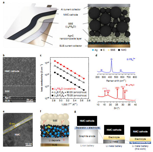 具有鋰金屬陽極的全固態(tài)電池是超越常規(guī)鋰離子電池性能的強(qiáng)大選擇。然而,不希望的鋰枝晶生長和低庫侖效率阻礙了它們的實際應(yīng)用。三星先進(jìn)研究院發(fā)現(xiàn),具有硫化物電解質(zhì)的高性能全固態(tài)鋰金屬電池是由不含過量鋰的Ag-C復(fù)合陽極實現(xiàn)的。薄的Ag-C層可以有效地調(diào)節(jié)Li的沉積,從而導(dǎo)致真正的長電化學(xué)循環(huán)性。在全電池演示中,作者使用了具有高比容量(> 210 mAh/g)和高面容量(> 6.8 mAh/cm2)的高Ni層狀氧化物陰極,以及一種銀輝石型硫化物電解質(zhì)。還引入了熱等靜壓技術(shù)以改善電極與電解質(zhì)之間的接觸。由此制備的原型袋式電池(0.6 Ah)表現(xiàn)出高能量密度(> 900 Wh/l),超過99.8%的穩(wěn)定庫侖效率和長循環(huán)壽命(1000次)。High-energy long-cycling all-solid-state lithium metal batteries enabled by silver-carbon composite anodes.
