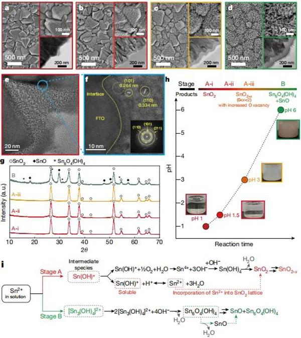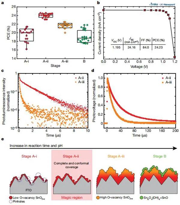 眾所周知,金屬鹵化物鈣鈦礦太陽能電池(PSCs)是一種新興的光伏技術(shù),具有打破成熟的硅太陽能電池市場的潛力。在過去的幾年里,由于制備方式,化學(xué)組成和相位穩(wěn)定方法的發(fā)展,器件性能有了很大的提高,使PSCs成為最有效和低成本的光伏技術(shù)之一。但是,這些器件的捕光性能仍然受到過多電荷載流子復(fù)合的限制。盡管付出了很多努力,但最佳的PSCs的性能還是受到相對較低的填充因子和高開路電壓缺陷的限制。電荷載流子管理的改善與填充因子和開路電壓密切相關(guān),因此為提高PSCs的器件性能并達(dá)到其理論效率極限提供了一條途徑。其中,基于SnO2的電子輸運層(ETLs)提供了有利的能帶對齊,同時能在低溫處加工。同時,在各種沉積方法中,基于SnO2納米顆粒的ETLs表現(xiàn)出了迄今為止最好的性能。但是,基于SnO2納米粒子的PSCs表現(xiàn)出相對較低的電致發(fā)光外部量子效率(EQE)。通過測量正向偏置下的發(fā)光效率確定的光伏器件的電致發(fā)光EQE是載流子復(fù)合輻射效率的直接度量。因此,至關(guān)重要的是開發(fā)出使ETLs/鈣鈦礦界面處的光電壓損失最小化的策略,使VOC最小化缺陷,從而研究者尋求另一種可以充分發(fā)揮SnO2 ETL潛力的沉積方法。鑒于此,麻省理工學(xué)院Moungi G. Bawendi,韓國化學(xué)技術(shù)研究所Jangwon Seo和Seong Sik Shin(通訊作者)報告了一種通過增強電荷載流子管理來提高PSCs性能的整體方法。首先,通過調(diào)整二氧化錫(SnO2)的化學(xué)浴沉積來開發(fā)具有理想膜覆蓋率,厚度和成分的電子傳輸層。其次,將鈍化策略在本體和界面之間解耦,從而改善了性能,同時使帶隙損失最小。研究表明,化學(xué)浴沉積過程中的Sn中間物在最終SnO2的質(zhì)量和特性中起著至關(guān)重要的作用層。更具體地講,各種Sn中間物質(zhì)的形成取決于Sn2+前驅(qū)體(SnCl2)的分解途徑,這取決于反應(yīng)溶液的pH。在正向偏置中,本文的器件顯示出高達(dá)17.2%的電致發(fā)光外量子效率和高達(dá)21.6%的電致發(fā)光能量轉(zhuǎn)換效率。作為太陽能電池,它們可實現(xiàn)25.2%的認(rèn)證功率轉(zhuǎn)換效率,相當(dāng)于其帶隙熱力學(xué)極限的80.5%。相關(guān)研究成果以“Efficient perovskite solar cells via improved carrier management”為題發(fā)表在Nature上。