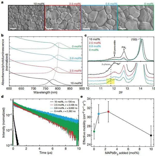 圖三、不同MAPbBr3摩爾百分比的鈣鈦礦薄膜的特性