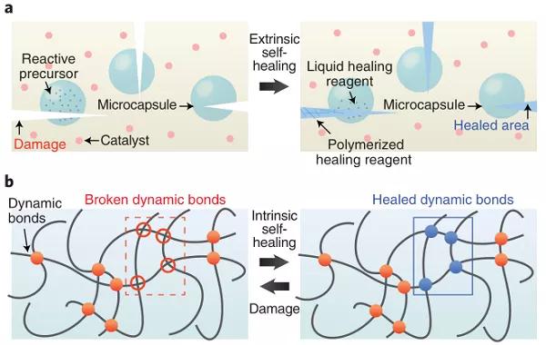 自修復(fù)材料可大致分為兩類:外源型(圖1a)和內(nèi)源型(圖1b)。當(dāng)分散的愈合劑(通常由聚合物基質(zhì)中的反應(yīng)性前驅(qū)物和催化劑組成)在損傷后釋放時(shí),會(huì)發(fā)生外源型自修復(fù)。這些愈合劑可以通過自主聚合反應(yīng)和交聯(lián)網(wǎng)絡(luò)的重建來修復(fù)損傷區(qū)域。盡管這種方法非??煽浚辉试S材料有限次數(shù)愈合,而且通常不能在相同的位置重復(fù)愈合。相比之下,內(nèi)源型自修復(fù)材料不需要添加愈合劑,并且受損區(qū)域能夠通過聚合物基質(zhì)的重組重復(fù)愈合。此過程是通過動(dòng)態(tài)共價(jià)鍵或非共價(jià)鍵的再生以及受損界面上聚合物鏈的纏繞重建了基體。