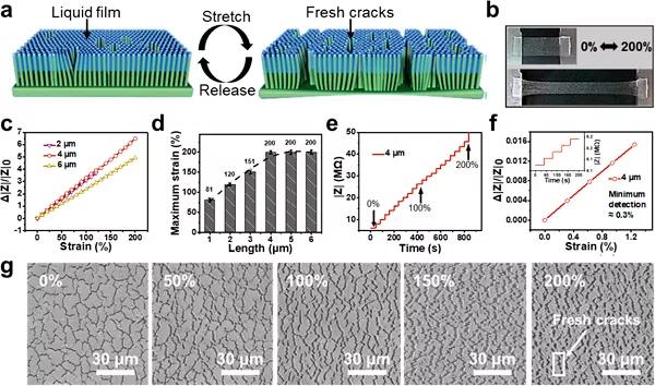 電阻應(yīng)變傳感器具有出色的靈敏度和順應(yīng)性,因此在柔性和可拉伸電子產(chǎn)品的開發(fā)中起著至關(guān)重要的作用。然而,由于固體導(dǎo)電層與聚合物之間的低粘合強(qiáng)度以及常規(guī)固體導(dǎo)電層內(nèi)部不可彌補(bǔ)的干摩擦,這種傳感器的耐用性較差。針對該問題,中國科學(xué)院理化技術(shù)研究所生物啟發(fā)智能界面科學(xué)實(shí)驗(yàn)室田野團(tuán)隊(duì)受動(dòng)物角膜淚膜的結(jié)構(gòu)和出色的耐磨性的啟發(fā),設(shè)計(jì)了基于由改性聚二甲基硅氧烷(PDMS)制成的仿生微絨毛上形成的均勻自修復(fù)無磨損液態(tài)膜的超耐久應(yīng)變傳感器。將包含離子液體的乙醇溶液添加到PDMS微絨毛中,由于表面化學(xué)性質(zhì)和特殊結(jié)構(gòu),該微絨毛具有超親液性。在蒸發(fā)過程中,離子液體通過壓力向上驅(qū)動(dòng),并形成連續(xù)的導(dǎo)電膜。作為傳感層,當(dāng)反復(fù)拉伸和釋放時(shí),由于濕摩擦而使毛細(xì)管穩(wěn)定化的液膜無損,并且在釋放后,由于毛細(xì)管力引起的自我修復(fù)能力,裂縫將完全恢復(fù),從而使應(yīng)變傳感器能夠具有超過22500個(gè)裝卸循環(huán)的高耐久性。這項(xiàng)工作提出了一種構(gòu)建超耐用電子產(chǎn)品的方法。