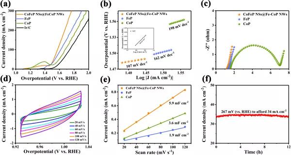 a)CoFeP NSs@Fe-CoP NWs樣品的極化曲線圖;b)CoFeP NSs@Fe-CoP NWs樣品的塔菲爾斜率圖;c)CoFeP NSs@Fe-CoP NWs樣品的阻抗圖譜;d)CoFeP NSs@Fe-CoP NWs樣品在不同速率下的CV曲線圖;e)CoFeP NSs@Fe-CoP NWs樣品的電流密度隨掃描速率的變化;f)CoFeP NSs@Fe-CoP NWs樣品在恒電位下的耐久性測試圖;g)CoFeP NSs@Fe-CoP NWs與Fe/Co基催化劑的HER活性對比圖。圖4. 2D/1D CoFeP NSs@Fe-CoP NWs催化劑在堿性電解質(zhì)中OER的電化學(xué)表征