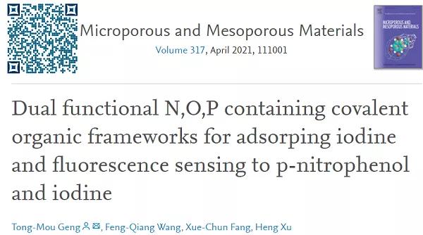 8. Microporous Mesoporous Mater.: 含N,O,P的雙功能共價有機框架用于吸附碘及對硝基苯酚和碘的熒光傳感