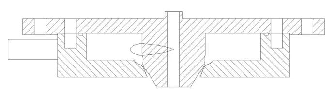 本文設(shè)計(jì)了一種結(jié)構(gòu)簡(jiǎn)單的霧化噴嘴, 噴嘴輪廓采用典型的拉瓦爾曲線, 可以在氣體壓力較低的情況下獲得超音速氣流。通過計(jì)算模擬 ,調(diào)節(jié)至最佳的結(jié)構(gòu)參數(shù), 采用有機(jī)玻璃作為主體材料, 考慮到經(jīng)濟(jì)性和加工方便, 采用環(huán)縫型的拉瓦爾噴嘴, 噴嘴的結(jié)構(gòu)如圖 1 所示。采用水代替金屬熔體, 氮?dú)庾鳛殪F化氣體, 在常溫條件下模擬真實(shí)情況下的氣霧化過程。通過 Fluent 軟件的計(jì)算模擬, 可以得到最佳結(jié)構(gòu)參數(shù)下, 霧化過程中流場(chǎng)、 溫度場(chǎng)等的分布情況,如圖2 所示。通過模擬實(shí)驗(yàn)的方法, 可以驗(yàn)證模擬結(jié)果的合理性。