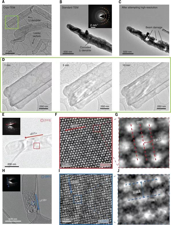 低溫轉(zhuǎn)移過(guò)程中成功地保存了枝晶,與低溫轉(zhuǎn)移的樣品相反,在室溫下插入TEM中的Li金屬被迅速消耗掉(圖3B)。這些暴露在空氣中的Li枝晶的表面比低溫轉(zhuǎn)移的Li枝晶更粗糙,對(duì)比度也更暗,這是因?yàn)樾纬闪硕嗑蜗?,選定區(qū)域電子衍射表明存在氫氧化鋰。此外,任何嘗用標(biāo)準(zhǔn)TEM在高分辨率下對(duì)鋰金屬枝晶成像的嘗試都會(huì)導(dǎo)致樣品破壞(圖3C)。在低溫條件下,在恒定電子束輻照下,即使在10分鐘后,也未檢測(cè)到枝晶形態(tài)的損壞。低溫下鋰枝晶的高分辨率圖像(圖3F,I)可分辨單個(gè)鋰原子,表明鋰枝晶是單晶的。