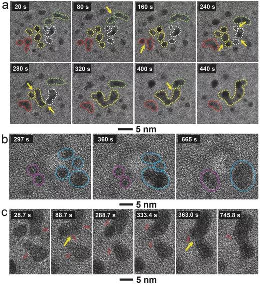 圖7 鉑納米線生長(zhǎng)過(guò)程的原位電鏡圖:a Pt納米線不同階段的生長(zhǎng)過(guò)程;b Pt形核之后的初始生長(zhǎng)過(guò)程;c Pt短鏈形成過(guò)程中Pt顆粒的旋轉(zhuǎn)、接觸和連接細(xì)節(jié)。