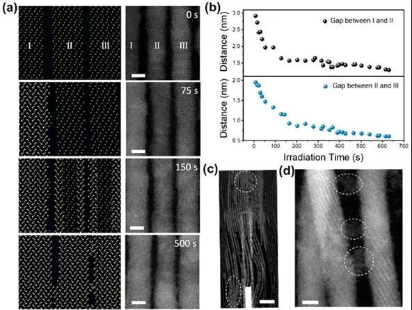 圖9 Ag在組裝納米線之間的遷移過(guò)程:a遷移過(guò)程中Te納米線之間的結(jié)構(gòu)變化;b納米線間距變化;(c-d)納米線遷移中間態(tài)連接橋。