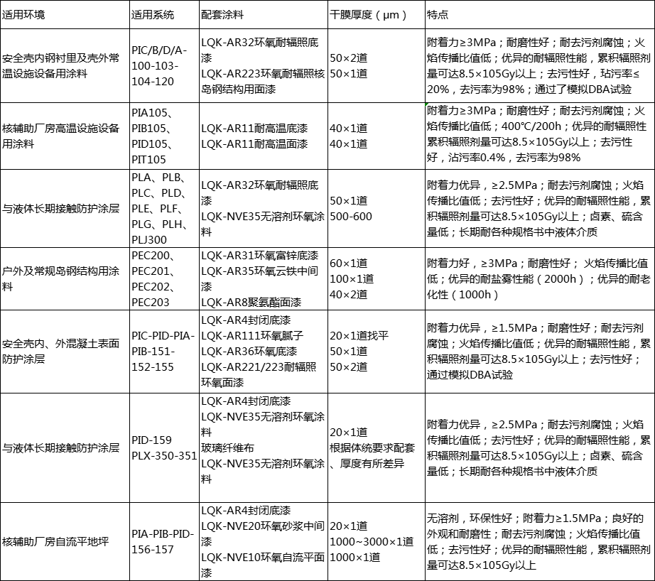 應用部位:安全殼外混凝土砼面;核輔助廠房常溫設施設備;核輔助廠房混凝土砼面