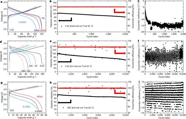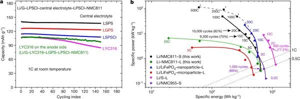 鋰金屬因其高容量和能量密度而被認(rèn)為是鋰離子電池負(fù)極的最佳候選材料,而單晶LiNi0.8Mn0.1Co0.1O2(NMC811)被認(rèn)為是下一代正極材料。采用NMC81正極與鋰金屬負(fù)極配對的電池的穩(wěn)定循環(huán)非常重要。然而,這種電池與大多數(shù)電解質(zhì),無論是液體還是固體,其穩(wěn)定性都很差。眾所周知,Li10±xM1±yP2±pS12±q(M=Ge,Si)與金屬鋰不穩(wěn)定。通常應(yīng)用石墨或金屬銦等保護層來絕緣固體電解質(zhì)和金屬鋰之間的接觸。如果沒有這種保護,使用純金屬鋰作為電極和Li10Ge1P2S12(LGPS)作為電解質(zhì)的對稱電池會在有電壓火花的情況下迅速失效。盡管大多數(shù)硫化物固體電解質(zhì)在與金屬鋰接觸時會發(fā)生一定程度的分解,但硫銀鍺礦型Li6-yPS5-yCl1+y與金屬鋰比LGPS更穩(wěn)定。Li5.5PS4.5Cl1.5(LPSCl)可以運行150小時以上。然而,之后仍然會出現(xiàn)短路。今日,在哈佛大學(xué)李鑫教授(通訊作者)團隊帶領(lǐng)下,報告了一種界面穩(wěn)定性(對鋰金屬響應(yīng))分層結(jié)構(gòu)的固態(tài)電池設(shè)計,實現(xiàn)無鋰枝晶穿透的超高電流密度。多層設(shè)計將較不穩(wěn)定的電解質(zhì)夾在較穩(wěn)定的固體電解質(zhì)之間,通過在較不穩(wěn)定的電解質(zhì)層中局部分解,阻止了任何鋰枝晶的生長。團隊提出了一種類似于膨脹螺絲效應(yīng)的機制,即任何裂縫都被動態(tài)生成的分解物所填充,而這些分解也受到很好的約束,可能是由分解引起的“錨定”效應(yīng)。鋰金屬負(fù)極與LiNi0.8Mn0.1Co0.1O2正極配對的循環(huán)性能非常穩(wěn)定,在20 C倍率下進(jìn)行10000次循環(huán)后,容量保持率為82%(8.6 mA/cm2),在1.5C倍率下進(jìn)行2000次循環(huán)后容量保持率為81.3%(0.64 mA/cm2)。同時,在微米級正極材料水平還能實現(xiàn)110.6 kW/kg的比功率和631.1 Wh/kg的比能量。相關(guān)成果以題為“A dynamic stability design strategy for lithium metal solid state batteries”發(fā)表在了Nature。
