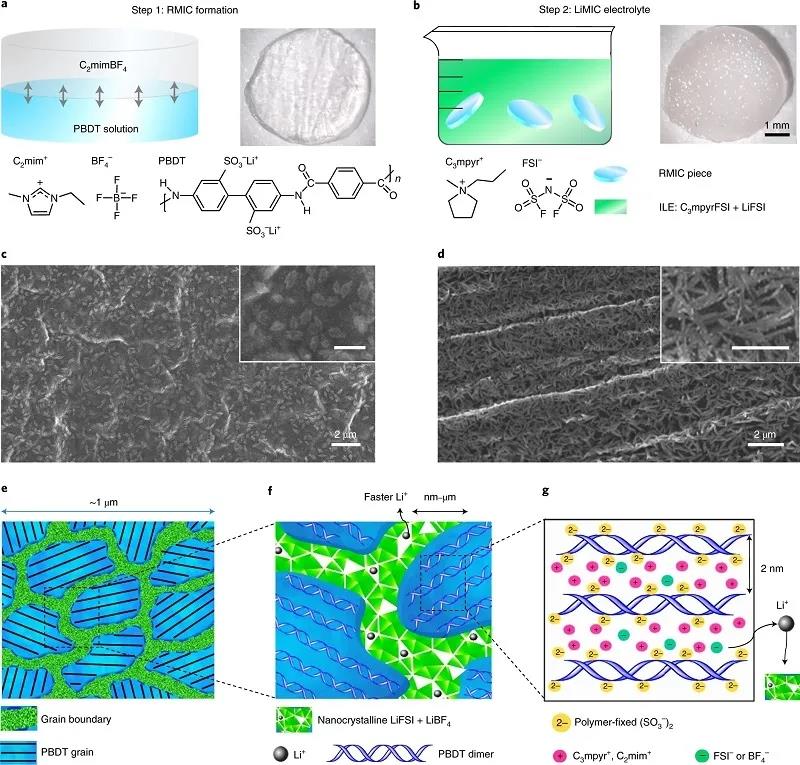 (d)在LiMIC中,PBDT LC晶粒間存在原位形成的高缺陷納米晶結(jié)構(gòu),由綠色形狀和黑點表示;