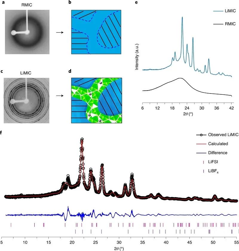 近日,美國弗吉尼亞理工學(xué)院與州立大學(xué)Louis A. Madsen(通訊作者)等人報道了一種固態(tài)MIC電解質(zhì),其不含揮發(fā)性溶劑,且顯示出高離子導(dǎo)電性、有利電極-電解質(zhì)接觸和高熱穩(wěn)定性,同時具有足夠的模量作為Li金屬電池的隔膜。在電解質(zhì)中加入Li鹽可以增加Li離子的導(dǎo)電性,并且為電極上的反應(yīng)提供Li離子。通過實驗表明,在包含N-丙基-N-甲基吡咯烷雙(氟磺酰基)酰亞胺(C3mpyrFSI)與LiFSI(3.2 mol kg-1)的離子液體電解質(zhì)(ILEs)中,Li金屬的循環(huán)速率很高?;谂c離子液體和濃鋰鹽結(jié)合的取向液晶聚合物的分子離子復(fù)合電解質(zhì),不僅實現(xiàn)高Li密度、高強度(200 MPa)和不可燃性,而且具有出色的Li+電導(dǎo)率(在25 °C時為1 mS cm-1)和電化學(xué)穩(wěn)定性(對比Li|Li+為5.6 V),同時抑制了枝晶的生長且表現(xiàn)出較低的界面電阻(32 Ω cm2),以及在Li對稱電池循環(huán)過程中顯示出過電位(在1 mA cm-2時≤120 mV)。異質(zhì)鹽摻雜工藝會修改局部有序的聚合物離子組裝,以結(jié)合填充有缺陷的LiFSI和LiBF4納米晶體的晶間網(wǎng)絡(luò),從而極大增強Li+傳輸。總之,這種模塊化材料制造平臺將陶瓷類導(dǎo)體的快速傳輸與聚合物電解質(zhì)的優(yōu)異柔性結(jié)合起來,為安全、高能量密度的能量存儲和轉(zhuǎn)換應(yīng)用提供了前景。研究成果以題為“Solid-state rigid-rod polymer composite electrolytes with nanocrystalline lithium ion pathways”發(fā)布在國際著名期刊Nature Materials上。