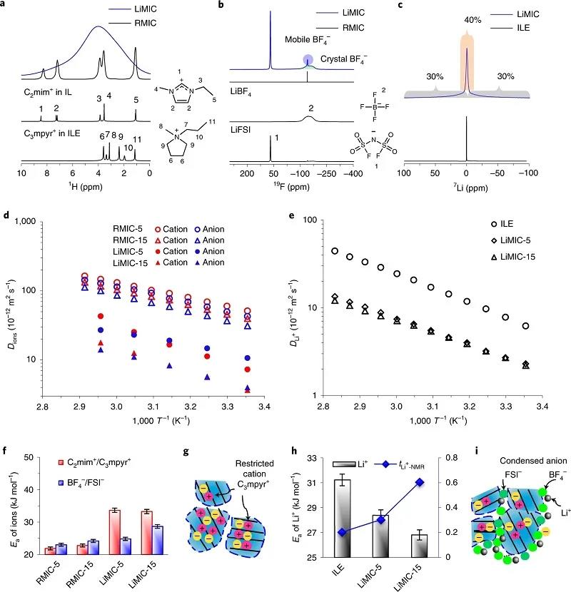 (a)純IL(C2mimBF4)、ILE(C3mpyrFSI和50 mol%LiFSI)、RMIC和LiMIC中陽離子的1H NMR光譜;