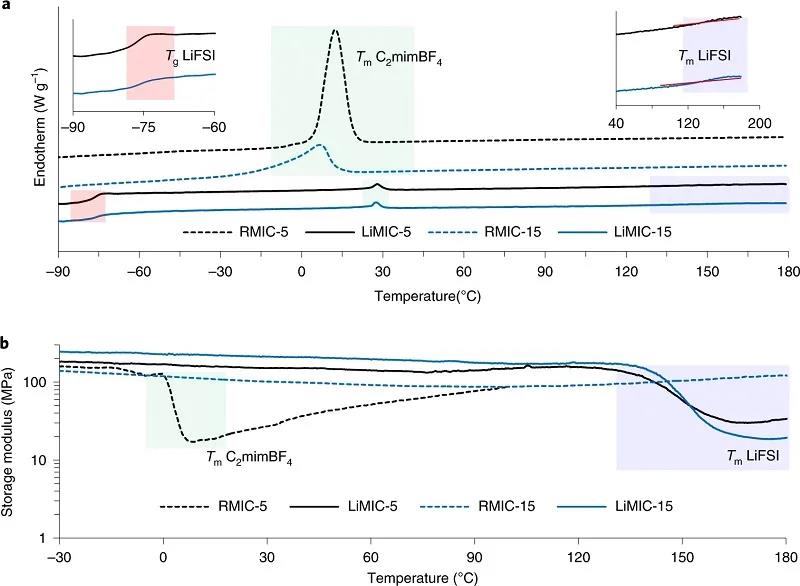 (b)DMA顯示RMICs和LiMICs在-30至180 °C的機械性能。