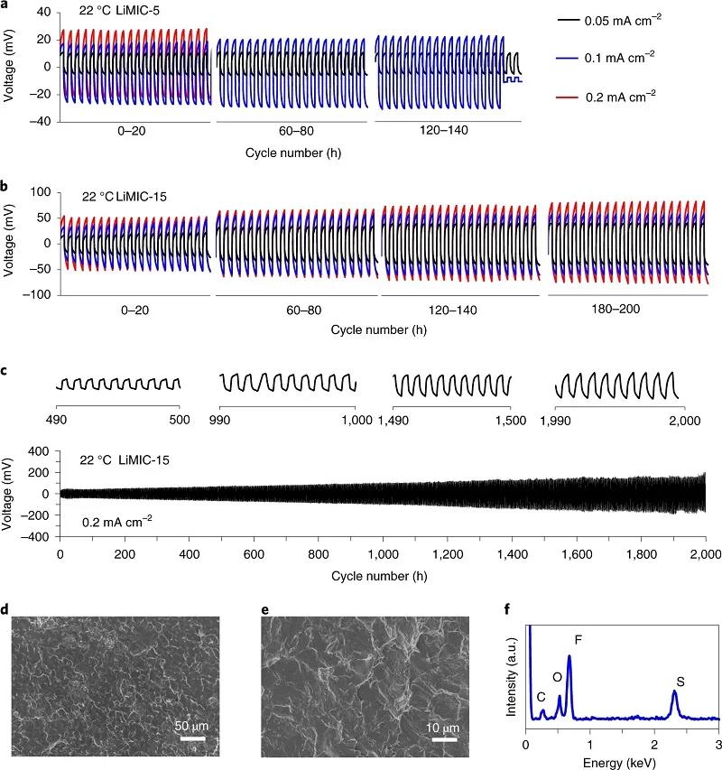 (d-e)使用LiMIC-15作為電解質(zhì)和隔膜,在c所示的2000 h長期循環(huán)后,拆卸后的Li金屬電極的放大倍數(shù)SEM圖像;