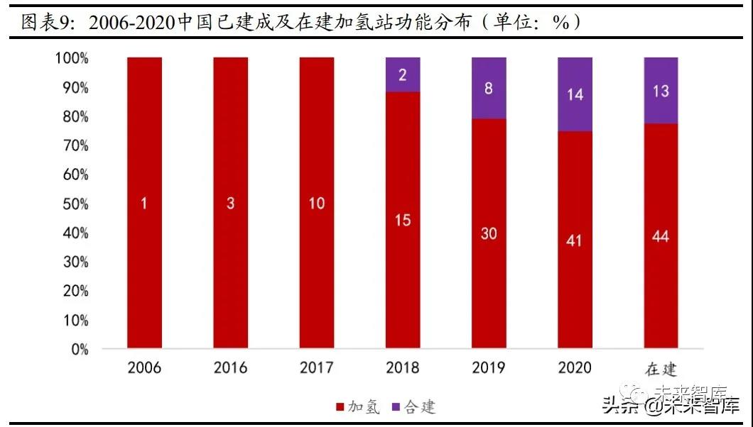 從加氫站的功能來看,國內(nèi)合建站占比逐年提高。根據(jù)《加氫站技術(shù)規(guī)范(國標(biāo) GB50516-2010)》,加氫站可以單站建設(shè), 但具有需要重新選址、投入成本高等弊端而 建設(shè)綜合加注站可以降低運營成本。國內(nèi)目前正積極探索“油、氫、氣、電”的聯(lián)合 建設(shè)運營模式,中石油、中石化等央企已開始進行相關(guān)的研發(fā)和建設(shè)。