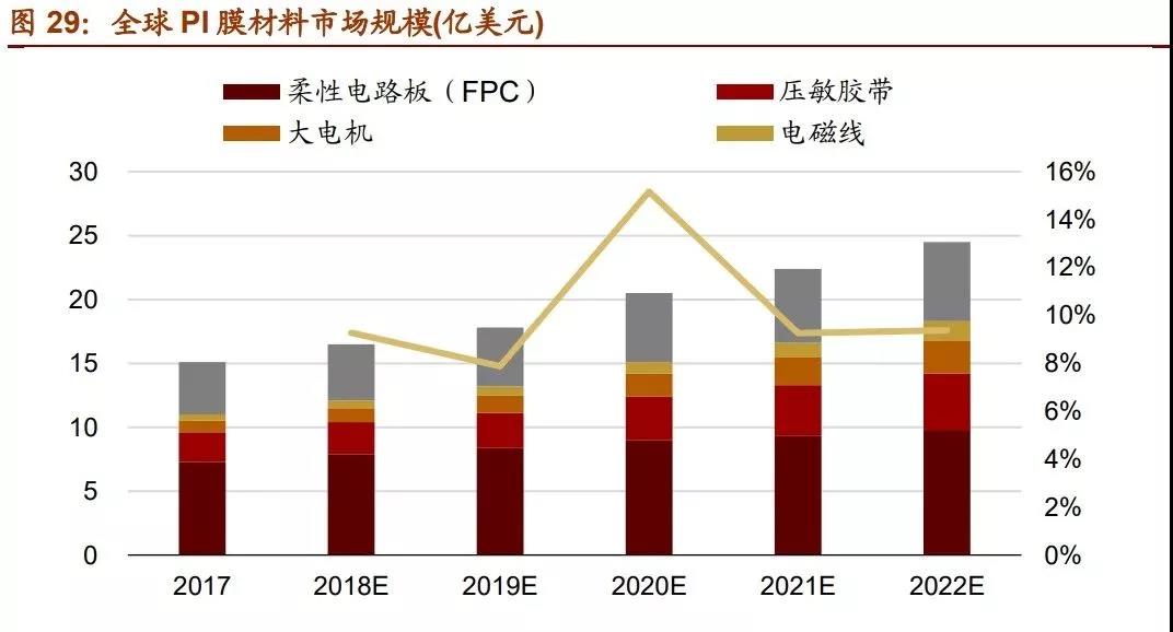PI 薄膜是市場(chǎng)規(guī)模最大的聚酰亞胺細(xì)分領(lǐng)域。2010 年以來,智能手機(jī)、電子顯示、柔 性電路板等領(lǐng)域快速發(fā)展,驅(qū)動(dòng) PI 薄膜產(chǎn)業(yè)快速發(fā)展。在 5G 與消費(fèi)電子創(chuàng)新周期的 驅(qū)動(dòng)下,天線材料、電子元器件、柔性顯示等領(lǐng)域有望維持強(qiáng)勁的發(fā)展勢(shì)頭。另外,主 要國家在航空航天領(lǐng)域加大投入,將會(huì)拉動(dòng)高性能特種 PI 膜的需求。