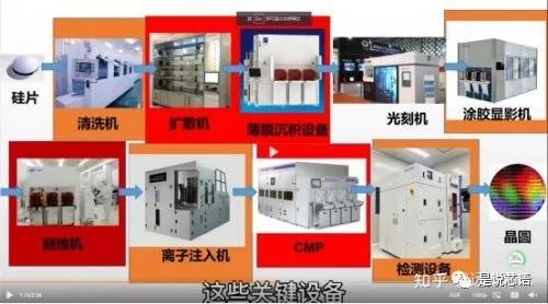 氧化擴(kuò)散機(jī),薄膜沉積設(shè)備,光刻機(jī),涂膠顯影機(jī),刻蝕機(jī),離子注入機(jī),CMP拋光設(shè)備,檢測(cè)設(shè)備,總共是八大設(shè)備。除此之外,還有一個(gè)清洗機(jī),貫穿多個(gè)工序,不清洗是沒(méi)辦法進(jìn)入下一環(huán)節(jié)的,因此總共是九大核心設(shè)備。