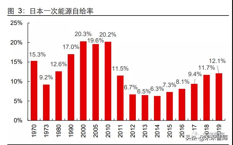 能源安全+減排降碳壓力下,日本大力發(fā)展氫能。日本國土面積狹小、自然資源匱乏, 能源對外依賴程度較高。石油、煤炭、天然氣為日本的主要一次能源來源,其中石油為 第一大能源,但 1973 年石油危機(jī)爆發(fā)導(dǎo)致油價暴漲和石油斷供風(fēng)險加大,日本為降低 對石油的依賴程度,引入核能、煤炭、天然氣等作為石油的替代能源,石油在日本的能 源供給比例從 1970s 的 70%以上降低至目前的 40%以下,煤炭和天然氣的供給比例持 續(xù)上升。值得一提的是,2011 年福島核事故導(dǎo)致日本的核能發(fā)展受阻,核能供給比例在 2011 年迎來斷崖式下降,目前仍處于較低位置。受此影響,日本的一次能源自給率從 2010 年的 20.2%高位降低至 2011 年的 11.5%,并在 2014 年進(jìn)一步降低至 6.3%的歷 史低位。同時,日本還面臨著 2050 年實(shí)現(xiàn)碳中和、2030 年溫室氣體排放量較 2013 年 降低 46%的減排壓力。尋找安全可靠清潔的替代能源,成為日本的當(dāng)務(wù)之急;清潔、高 效、靈活的氫能成為日本的重要選擇。