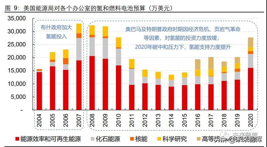 氫能的發(fā)展離不開政府的財政支持,美國能源部主要通過“氫能規(guī)劃”(DOE Hydrogen Program)實(shí)現(xiàn)對氫和燃料電池技術(shù)的研究和應(yīng)用,規(guī)劃制定了從研發(fā)到產(chǎn)業(yè)化的計劃 路線,跨越 2000~2040 年。2004-2020 年美國能源部對氫和燃料電池的預(yù)算支出金額 合計約 37 億美元,年均支出 2.2 億美元;其中 2008 年奧巴馬政府上臺后,受經(jīng)濟(jì)危機(jī) 和頁巖氣革命爆發(fā)影響,政府氫能預(yù)算支出減少;特朗普政府時期也更加重視傳統(tǒng)能源 的發(fā)展;而 2020 年美國新版國家氫能戰(zhàn)略發(fā)布及碳中和壓力下,氫能的預(yù)算支出同比 增加 37%至 2.77 億美元。