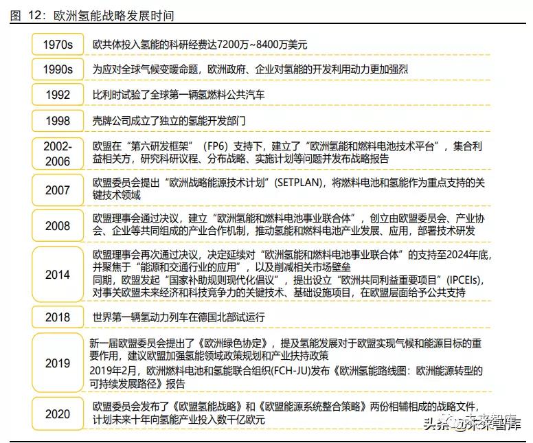 歐洲大力發(fā)展氫能的動力,同樣來自全球石油危機(jī)后對能源安全的追求,及全球氣候變 暖背景下的降碳壓力。2020 年歐盟委員會發(fā)布了《歐盟氫能戰(zhàn)略》和《歐盟能源系統(tǒng)整 合策略》兩份相輔相成的戰(zhàn)略文件,計劃未來十年向氫能產(chǎn)業(yè)投入數(shù)千億歐元。從歐盟 的規(guī)劃可以看出,基于風(fēng)電和光伏等可再生能源的綠氫為其重點(diǎn)鼓勵和發(fā)展方向;氫能 戰(zhàn)略的投資計劃涵蓋制氫、儲運(yùn)氫、加氫的全產(chǎn)業(yè)鏈,以及碳捕集技術(shù)升級改造、氫能 煉鋼等,預(yù)計總投資規(guī)模約 3200-4600 億歐元。(報告來源:未來智庫)