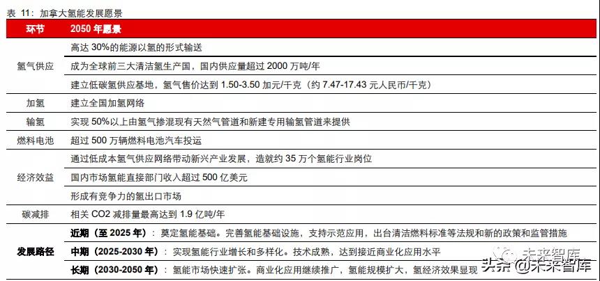 2020 年 12 月加拿大發(fā)布國家氫能戰(zhàn)略,目標(biāo)通過加強(qiáng)氫能基礎(chǔ)設(shè)施建設(shè)及促進(jìn)終端應(yīng) 用,降低氫能使用成本,降低國家碳排放量,同時成為全球主要?dú)淠芄?yīng)國。加拿大目 標(biāo)到 2050 年實(shí)現(xiàn)國內(nèi)氫供應(yīng)量超過 2000 萬噸/年,氫氣售價降低至 1.50-3.50 加元/千 克(約 7.47-17.43 元人民幣/千克);建立全國加氫網(wǎng)絡(luò);實(shí)現(xiàn) 50%以上氫氣由現(xiàn)有天然 氣管道或新建專用儲氫管道提供;投運(yùn)超過 500 萬輛燃料電池汽車。