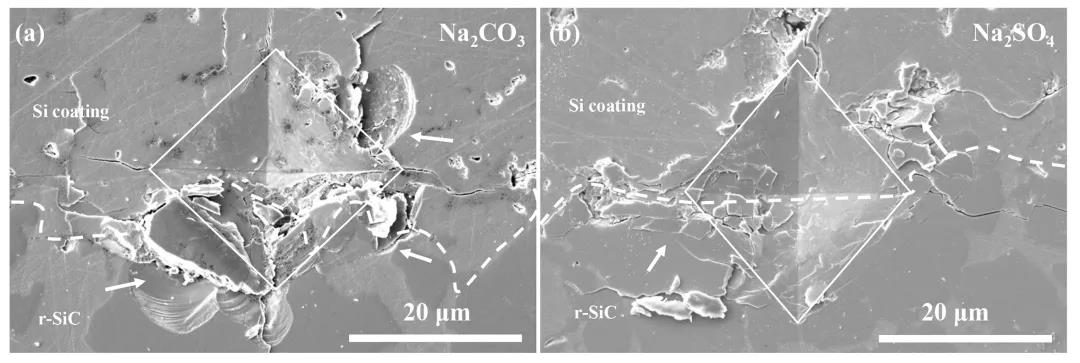 圖 5 為在 900℃熔鹽中處理 4 h 的 SiC 陶瓷表面制備的 Si 涂層與基體界面處的壓痕形貌。從圖5(a) 可以看出, 經(jīng) Na2CO3 熔鹽腐蝕試樣的壓痕形貌完整,靠近壓痕處的裂紋較明顯,同時(shí)壓痕附近出現(xiàn)了崩落的痕跡,推測(cè)此處應(yīng)力較大。從圖5(b) 可以看出,經(jīng) Na2SO4 熔鹽腐蝕試樣的壓痕形貌完整,壓痕附近的裂紋較細(xì)小。