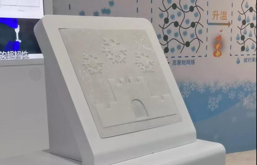給水凝膠加上一層自制冷裝置,就能做出冰板、冰墻。升溫時水不滴落,可以用于制作精美浮雕——這是世界上現(xiàn)有的唯一可長期在冰上保存浮雕的技術(shù)方案。在科技館中展出的冰板上,就雕刻著“城樓”和“雪花”。雖然摸的人不少,但圖案的形狀一直保持清晰。