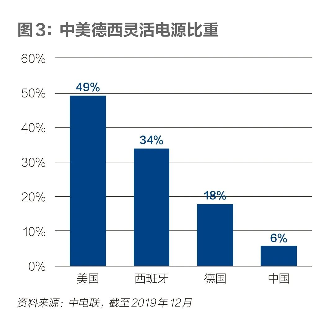 中電聯(lián)2019年12月發(fā)布的《煤電機(jī)組靈活性運(yùn)行政策研究》顯示,歐美國家的靈活電源比重普遍較高,西班牙、德國、美國占比分別為34%、18%、49%,而中國占比不到6%。在中國新能源資源富集的三北地區(qū),風(fēng)電、太陽能發(fā)電裝機(jī)分別占全國的72%、61%,但靈活調(diào)節(jié)電源還不足3%。