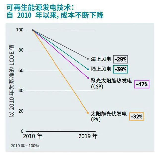過去十年,光伏和風(fēng)電的度電成本分別下降了約八成和四成,且仍有進(jìn)一步下降空間。