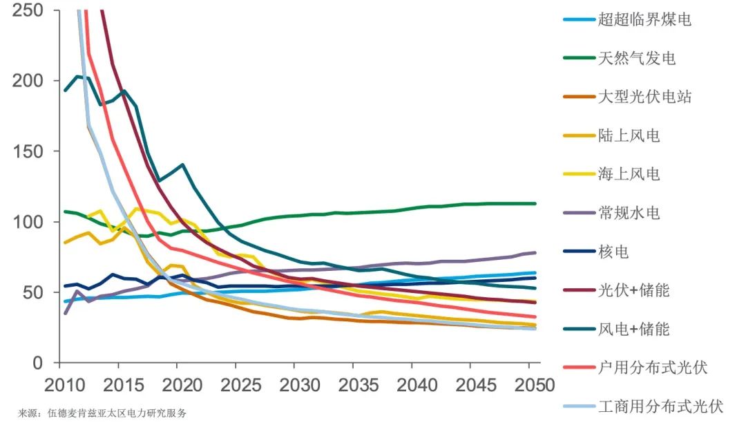 據(jù)國際能源咨詢公司伍德麥肯茲近期發(fā)布的報(bào)告,未來十年,火電的成本還將上升,光伏、風(fēng)電則有40%—50%的成本下降空間。2035年是一個(gè)分水嶺,屆時(shí)中國所有可再生能源發(fā)電的成本都將比煤電低。如果再加上為碳排放支付的費(fèi)用,煤電成本將高出10%—15%。