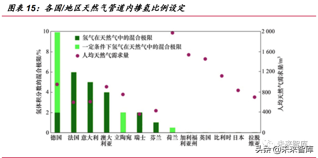 氫能產(chǎn)業(yè)發(fā)展初期階段,管道氫可由天然氣管道摻氫來(lái)實(shí)現(xiàn)過(guò)渡。由于純氫管 道的初始投資較大,不適合作為氫能發(fā)展初期應(yīng)用,在管道運(yùn)輸發(fā)展初期,可以積極 探索摻氫天然氣方式,即利用已建設(shè)的天然氣輸配管網(wǎng)與基礎(chǔ)設(shè)施進(jìn)行天然氣和氫氣 混合輸送,也可經(jīng)改造后輸送純氫,可實(shí)現(xiàn)低成本、規(guī)?;⑦B續(xù)性氫能供應(yīng)。研究 結(jié)果表明,在含量較低時(shí)(10-20%摻氫比例),氫氣可以在不做重大技術(shù)調(diào)整的情況 下?lián)交熘撂烊粴?。未?lái)大力發(fā)展天然氣摻氫管道輸送技術(shù),關(guān)鍵需要解決管材、調(diào)壓 站、流量計(jì)、探測(cè)器等配套裝備的摻氫相容性與適應(yīng)性并完善管網(wǎng)安全運(yùn)行保障技術(shù)。 天然氣摻氫管道輸送技術(shù)是目前進(jìn)行大規(guī)模、長(zhǎng)距離氫氣輸送最為有效手段之一。