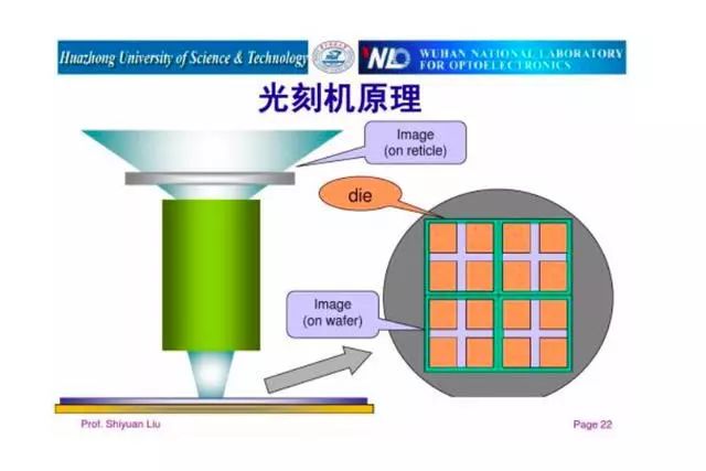 在光刻技術(shù)的原理下,人們制造了光刻機(jī),光刻機(jī)通過(guò)一系列的光源能量、形狀控制手段,將光束透射過(guò)畫著線路圖的掩模,經(jīng)物鏡補(bǔ)償各種光學(xué)誤差,將線路圖成比例縮小后映射到晶圓上,不同光刻機(jī)的成像比例不同,有5:1,也有4:1。然后使用化學(xué)方法顯影,得到刻在晶圓上的電路圖(即芯片)。