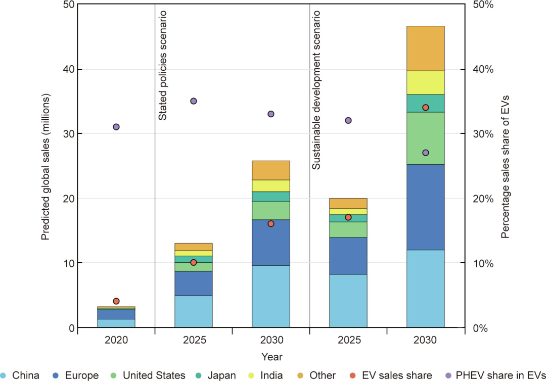 圖1 基于當前(2020年)公布的國家政策(中間和左側欄)和可持續(xù)發(fā)展形勢(右側欄),預計電動汽車國際銷量如圖所示。橙色圓圈代表電動汽車銷量占汽車總銷量的比例,紫色圓圈代表插電式混合動力電動汽車(PHEV)銷量在所有電動汽車銷量中所占的比例。來源:International Energy Agency,經許可。