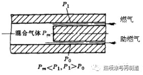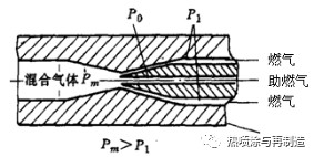熱噴涂常采用的是預(yù)混燃燒方式。在預(yù)混燃燒中,燃料氣和助燃?xì)獾幕旌戏绞街饕猩湮交旌虾偷葔菏交旌蟽煞N。射吸式混合指燃燒氣與助燃?xì)獍磭娚淦髟砘旌?,一般以助燃?xì)庾鰢娚錃怏w,如圖2所示。
