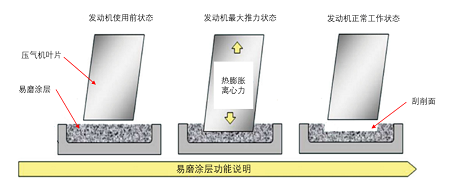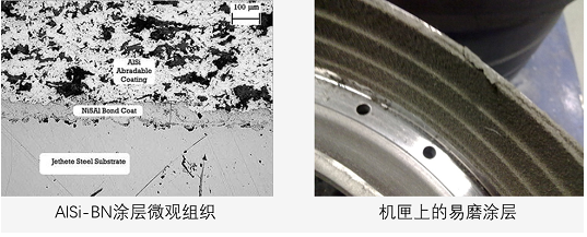 易磨涂層(Abradable Coating),是發(fā)動機葉尖封嚴系統(tǒng)的一部分,也叫“封嚴涂層”。通常應(yīng)用于機匣零件中的跑道面,主要作用是減少葉尖碰磨損傷。由于易磨涂層需要跟葉尖進行對磨,為了保護葉尖,易磨涂層一般硬度小,結(jié)合力差,從而能夠保證葉尖在大服役狀態(tài)碰上時,能夠有效地刮削涂層。