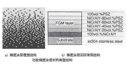 在熱障涂層中,由于粘結(jié)層金屬和氧化鋯陶瓷的熱膨脹系數(shù)差異較大,這種差異將導(dǎo)致涂層內(nèi)應(yīng)力過大,并且在熱循環(huán)條件下常發(fā)生陶瓷涂層的早期破壞。為了減小內(nèi)應(yīng)力,提高涂層與基體的結(jié)合強(qiáng)度,材料科學(xué)家開始在常規(guī)熱障涂層中引入功能梯度材料制備技術(shù)。