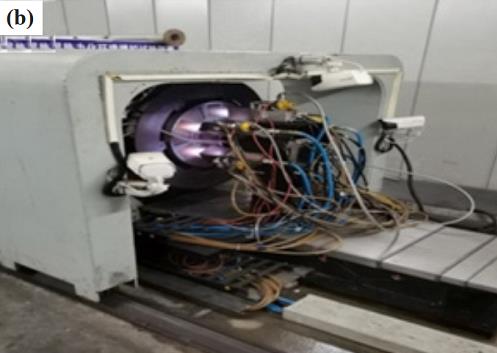 為了解決熱障涂層地面試車前考核評(píng)價(jià)平臺(tái)缺失、 關(guān)鍵損傷參數(shù)不清的難題, 研制了渦輪葉片熱障涂層熱力化耦合動(dòng)態(tài)試驗(yàn)?zāi)M與測(cè)試裝置。裝置通過(guò)高速電機(jī)帶動(dòng)載有渦輪盤的主軸旋轉(zhuǎn),超音速燃?xì)鈬姌屖褂煤娇彰河妥鋈剂希?純氧做助燃劑, 噴槍在導(dǎo)軌的帶動(dòng)下可深入燃燒室對(duì)旋轉(zhuǎn)的渦輪葉片進(jìn)行加熱, 渦輪葉片最大旋轉(zhuǎn)直徑為460 mm。 圖 1(a)、 (b) 分別為同時(shí)點(diǎn)燃六把燃?xì)鈬姌尯蛧姌屔钊肴紵倚Ч麍D。 試驗(yàn)選擇 6000 r/min、 1000 ℃ 作為主要考核工況, 即渦輪葉片以6000 r/min 速度旋轉(zhuǎn)時(shí)熱障涂層表面最高溫度需要達(dá)到 1000℃。 一次熱沖擊循環(huán)包括升溫、 保溫階段共 5 min 和降溫階段 5 min。 實(shí)驗(yàn)開始前渦輪葉片以預(yù)定轉(zhuǎn)速旋轉(zhuǎn), 點(diǎn)燃的噴槍在導(dǎo)軌上前進(jìn)時(shí)開始計(jì)時(shí)。 保溫階段結(jié)束后, 噴槍從燃燒室中移出熱障涂層開始降溫, 降溫過(guò)程結(jié)束后葉片停止旋轉(zhuǎn)。 為分析不同服役轉(zhuǎn)速對(duì)涂層表面溫度以及應(yīng)變損傷的影響, 對(duì)比轉(zhuǎn)速選擇 5000 r/min 和4000 r/min。