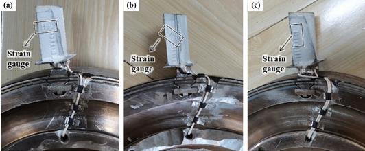 圖 3 在不同角度安裝應(yīng)變計(jì)的熱障涂層葉片: (a) 0° ; (b) 45° ; (c) 90°