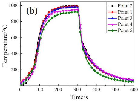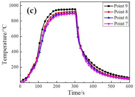 由圖 4 溫度測(cè)點(diǎn)和截面各點(diǎn)時(shí)間溫度變化曲線可知, 點(diǎn)1~5的最高溫度分別是992 ℃、 1000 ℃、985 ℃、 948 ℃和 921 ℃, 點(diǎn) 6~9 的最高溫度分別是 905 ℃、 897 ℃、 921 ℃、 956 ℃。 整體上, 吸力面溫度高于壓力面, 前緣的溫度高于尾緣, 其中溫度最高的位置出現(xiàn)在吸力面靠近前緣處( 測(cè)點(diǎn) 2, 1000 ℃) 、 最低位置在壓力面尾緣( 測(cè)點(diǎn)7, 897 ℃) 。 這是因?yàn)樵谌~片旋轉(zhuǎn)過(guò)程中, 高溫燃?xì)饴氏仍谖γ媾c渦輪葉片發(fā)生交互作用, 吸力面被加熱的更充分; 前緣靠近焰心并且正對(duì)火焰沖擊, 所以在前緣整體溫度大于尾緣。 在噴槍未完全進(jìn)入燃燒室之前溫升速率較慢, 隨后升溫速率顯著提高, 最終各測(cè)點(diǎn)相繼達(dá)到穩(wěn)定狀態(tài)。