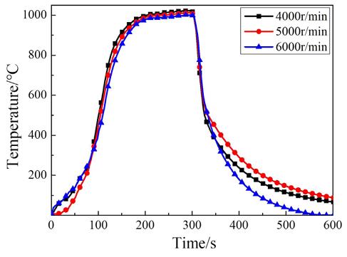 圖 為測(cè)溫點(diǎn) 以表 參數(shù)加熱時(shí)不同轉(zhuǎn)速下的溫度變化曲線, 在下的溫度變化曲線, 在 6000 r/ min、5000 r/min、4000 r/min 的穩(wěn)定溫度分別為 1000 ℃、1013 ℃、1022 ℃??梢钥闯?,加熱參數(shù)不變時(shí)隨著轉(zhuǎn)速的降低, 溫度呈小幅升高的趨勢(shì)。 這是因?yàn)槭芪槽E導(dǎo)流的影響, 轉(zhuǎn)速越高渦輪葉片承受的風(fēng)阻越大,帶走的熱量越多, 所以涂層表面溫度越低。 與此同時(shí), 周圍相對(duì)低溫的氣流會(huì)在葉片表面形成“冷卻氣膜”, 轉(zhuǎn)速越高低溫氣流的冷卻效果便越顯著。