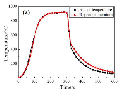 用于溫度補(bǔ)償?shù)纳惦娮锠t由爐膛、 樣品升降臺(tái)和溫度控制系統(tǒng)等組成。 實(shí)驗(yàn)前, 將電阻爐加熱到終態(tài)保溫溫度( 反饋熱電偶在爐膛內(nèi)) ,同時(shí)在溫控系統(tǒng)中輸入要實(shí)現(xiàn)的時(shí)間溫度變化曲線( 反饋熱電偶在熱障涂層表面) 。 當(dāng)載有測(cè)溫葉片的升降臺(tái)開始上升, 爐膛下方隔熱擋板將自動(dòng)移開, 在熱輻射的作用下熱障涂層表面開始升溫。 隨后樣品臺(tái)自動(dòng)調(diào)節(jié)上升速率確保測(cè)點(diǎn)的實(shí)時(shí)溫度與輸入的溫升曲線一致。 在保溫階段, 高溫爐的反饋熱電偶會(huì)切換為熱障涂層表面的測(cè)溫?zé)犭娕迹?即通過(guò)調(diào)節(jié)爐膛整體溫度來(lái)維持樣品表面溫度恒定。 降溫階段, 樣品臺(tái)下降的同時(shí),周圍變頻風(fēng)扇啟動(dòng)并自動(dòng)調(diào)節(jié)風(fēng)速來(lái)輔助樣品降溫。隨后保存控制參數(shù), 放入應(yīng)變測(cè)試所用的熱障涂層葉片, 當(dāng)升降爐執(zhí)行記憶的溫升過(guò)程, 啟動(dòng)應(yīng)變儀采集此過(guò)程的應(yīng)變量。 吸力面和壓力面應(yīng)變測(cè)點(diǎn)的溫升重復(fù)曲線與實(shí)際溫度曲線如圖 6。 由圖可見(jiàn)溫升重復(fù)曲線與實(shí)際溫升曲線基本一致,保溫階段誤差較小, 升溫和降溫階段最高存在 12℃ 誤差, 這是因?yàn)樯禍剡^(guò)程溫度變化較快, 對(duì)程序和設(shè)備的迅速反應(yīng)要求較高。 整體趨勢(shì)上,此補(bǔ)償方法滿足溫度校準(zhǔn)的需求, 可用于熱輸出曲線的測(cè)量。