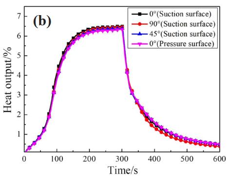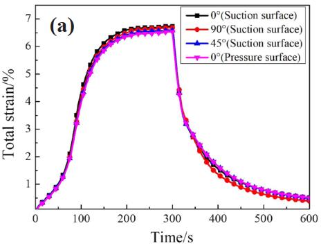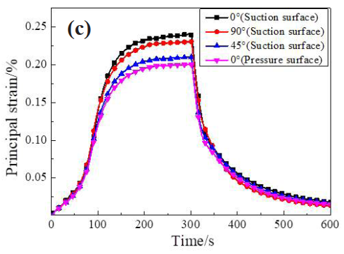 如 圖 所 示 為 1000 ℃、 6000 r/min 測(cè) 試 狀態(tài)下, 個(gè)應(yīng)變測(cè)點(diǎn)應(yīng)變總量曲線 (a)、 熱輸出曲線 (b) 和二者作差得到的主應(yīng)變曲線 (c)。 對(duì)保溫時(shí)穩(wěn)定狀態(tài)的應(yīng)變進(jìn)行分析, 可見(jiàn)熱輸出在應(yīng)變總量中占比很高。 由圖 7(c) 可知, 吸力面主應(yīng)變(0.23%) 大于壓力面 (0.20%), 在不同的安裝角度,、 90°、 45° 方向的主應(yīng)變分別為 0.24%、 0.23%、0.21%。 吸力面溫度高具有更大熱應(yīng)力, 同時(shí)也承受著更多的氣流沖擊, 因此主應(yīng)變高于壓力面。應(yīng)變計(jì)示值反應(yīng)的是應(yīng)變計(jì)敏感柵接觸范圍內(nèi)的總變形, 安裝方向平行于緣板 (0°) 時(shí)截面方向溫度梯度高、 敏感柵所受應(yīng)變梯度大, 因此形變量最大。 垂直于緣板方向 (90°) 的應(yīng)變梯度較小但與燃?xì)獾慕佑|面積變大、 受到更多剪切式氣流沖刷, 因此在多重機(jī)制共同作用下, 0° 方向應(yīng)變大于 90° 大于 45°
