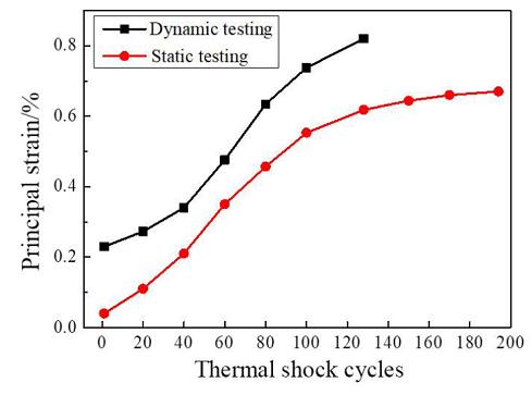 為了分析熱障涂層失效的損傷演變過(guò)程及其失效機(jī)理, 對(duì)動(dòng)、 靜態(tài)熱循環(huán)過(guò)程進(jìn)行了應(yīng)變損傷演化的實(shí)時(shí)檢測(cè)。 綜合考慮應(yīng)變測(cè)點(diǎn)的穩(wěn)定性與典型性, 選擇在吸力面 90° 安裝的應(yīng)變計(jì)對(duì)熱循環(huán)過(guò)程進(jìn)行應(yīng)變采集。 涂層失效判定條件為剝落面積達(dá)到 10% 或剝落長(zhǎng)度大于 10 mm, 每 20次循環(huán)進(jìn)行一次采樣繪制。 圖 10 為帶熱障涂層渦輪葉片動(dòng)態(tài)與靜態(tài)熱沖擊循環(huán)考核過(guò)程中最大主應(yīng)變演化曲線。 圖中可以看出, 動(dòng)態(tài)熱沖擊主應(yīng)變?cè)?nbsp;0.23%~0.82% 之間, 靜態(tài)熱沖擊主應(yīng)變?cè)?/span>0.04%~0.67% 之間, 均為拉伸變形。 動(dòng)態(tài)熱沖擊實(shí)驗(yàn)熱障涂層經(jīng)歷 128 次循環(huán)剝落失效, 低于靜態(tài)測(cè)試的 194 次, 但失效前最大主應(yīng)變高于靜態(tài)。在動(dòng)態(tài)與靜態(tài)熱沖擊循環(huán)考核過(guò)程中, 雖然測(cè)點(diǎn)的溫度變化一致, 但動(dòng)態(tài)測(cè)試在高速旋轉(zhuǎn)過(guò)程需要承受氣流激振力與離心力等多種復(fù)雜載荷, 因此相同循環(huán)次數(shù)下的主應(yīng)變高于靜態(tài)。 對(duì)比失效前最后的應(yīng)變狀態(tài), 二者主應(yīng)變差值有所減小,說(shuō)明涂層的剝落失效是疲勞損傷的累積過(guò)程, 剝落時(shí)最大主應(yīng)變需要達(dá)到一定的臨界條件。