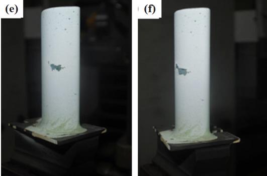 圖 12 靜態(tài)考核過(guò)程熱障涂層的宏觀形貌演變: (a) 0 次循環(huán); (b) 30 次循環(huán); (c) 60 次循環(huán); (d) 90 次循環(huán);(e) 120 次循環(huán); (f) 150次循環(huán); (g) 180 次循環(huán); (h) 194 次循環(huán)