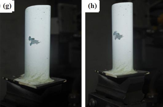 圖 11 動(dòng)態(tài)考核過(guò)程熱障涂層的宏觀形貌演變: (a) 0 次循環(huán); (b) 20 次循環(huán);(c) 40 次循環(huán); (d) 60次循環(huán); (e) 80 次循環(huán); (f) 100 次循環(huán); (g) 120 次循環(huán); (h) 128 次循環(huán)