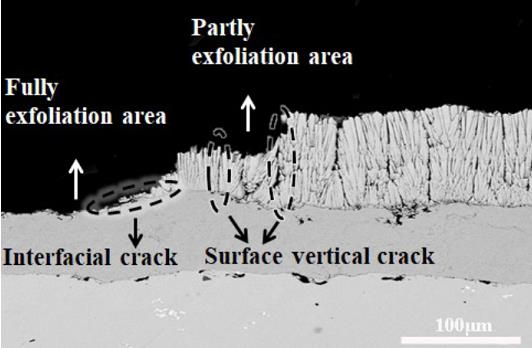為了對(duì)高速旋轉(zhuǎn)熱障涂層進(jìn)行失效模式分析,采用 SEM 觀測(cè)了剝落區(qū)域熱障涂層微觀結(jié)構(gòu)特征。 斷面顯微圖片如圖 13, 從圖可以看出未剝落區(qū)域的熱障涂層依舊保持完整形貌。 剝落區(qū)明顯可見(jiàn)熱障涂層柱狀晶已經(jīng)折斷或完全從粘接層脫離, 并且被折斷的涂層因?yàn)槭艿絿?yán)重侵蝕產(chǎn)生大量表面垂直裂紋。 涂層剝落的原因可歸結(jié)為以下幾點(diǎn): (1) 剝落集中在葉背的高溫區(qū), 此處溫度梯度高、 應(yīng)變梯度大; (2) 高溫、 高壓燃?xì)獾臎_刷導(dǎo)致柱狀晶逐漸減薄, 從而引發(fā)涂層剝落; (3) 高速旋轉(zhuǎn)加速了柱狀晶的折斷以及裂紋的生長(zhǎng), 促使剝落區(qū)域集中在離心載荷最大的葉冠處。